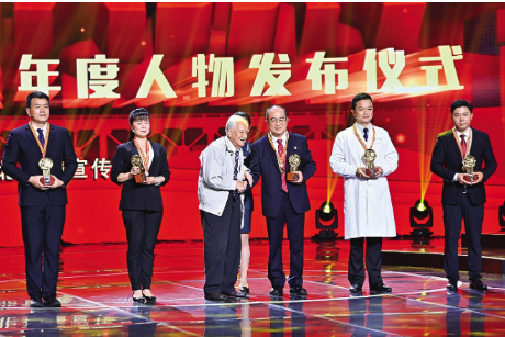 當(dāng)95歲高齡的黃老出現(xiàn)在舞臺上時,張定宇快步向前迎接,這一幕令人動容。黃老在攙扶下,為張定宇戴上獎?wù)拢澳転槟泐C獎,我感到很榮幸。你是祖國的驕傲,人民的英雄!”