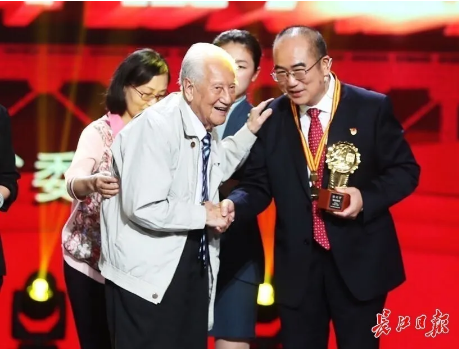 當(dāng)主持人念出“給‘人民英雄’張定宇頒獎的是‘共和國勛章’獲得者黃旭華”時,臺下爆發(fā)出熱烈的掌聲。