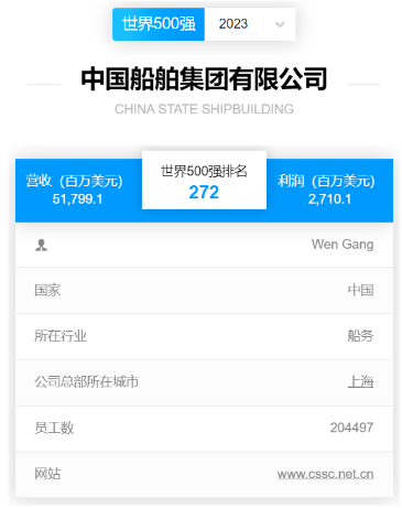 北京時間2023年8月2日,《財富》中英文網站同時發(fā)布2023《財富》世界500強排行榜,中國船舶集團有限公司以517.991億美元的營業(yè)收入位列全球榜單第272位,自2021年重組后首次申報以來連續(xù)三年上榜,蟬聯全球造船企業(yè)首位。
