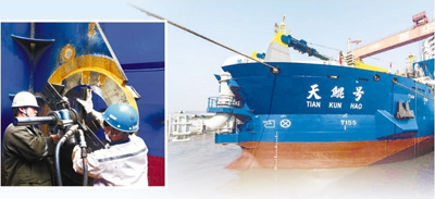 “船上鋼樁臺車安裝了4個大油缸,單個就達38噸,所有安裝誤差都只有0.2毫米”,安裝輪機車間主任沙勝紅說,“考驗還在繼續”。輪機車間的工人全部是訓練有素的技術員工,他們克服了難以想象的困難,硬是拿下全船高難度的設備安裝工作,質量贏得船東、船檢的一致好評。