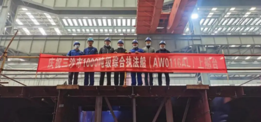 ????這是三沙市1000噸級綜合執法船首制分段上船臺,武船集團僅用12個工作日就保質保量完成了首制分段的制造及全部預舾裝工作。