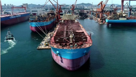 1月4日,中國船舶集團旗下大船集團為馬士基油輪建造的11.5萬噸原油/成品油船44號船簽字交付。該船總長250米,型寬44米,型深21.9米,載重噸為11.5萬噸,結構吃水15.35米,設計航速14.5節,掛新加坡旗,入英國勞氏船級社。為了滿足節能設計要求,該船螺旋槳前方的船體艉軸管上安裝節能型導輪,螺旋槳輕轉裕度不低于3%。