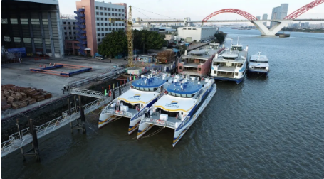 2020年12月30日,中國船舶集團旗下遠舟公司所屬英輝南方造船(廣州番禺)有限公司建造的“新海韻”號、“新海駿”號兩艘鋁合金雙體高速客船,同時在廣州市番禺區英輝南方碼頭順利交付。“新海韻”、“新海駿”是英輝南方為船東建造的藍色干線系列高速客船的第8和第9艘,船長42.8米,寬10.3米,載客199人,設計航速35節。遠舟公司所屬英輝南方在鋁合金高速客船第三代船型基礎上,開展技術創新和船型優化,開發完成了“新海韻”、“新海駿”為代表的第四代新船型。