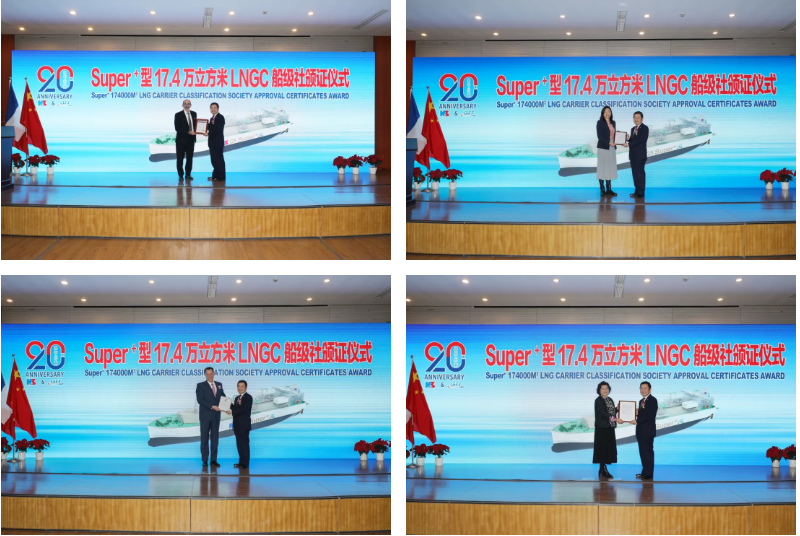 12月16日,由中國船舶集團旗下滬東中華與法國GTT公司聯合研發的全球最新一代“長恒系列”17.4萬立方米液化天然氣(LNG)運輸船獲得美國船級社(ABS)、法國船級社(BV)、英國勞氏船級社(LR)、DNV等四家國際著名船級社頒發的船型設計通用認可(GDA)、入級預先認可(PCA)等證書。標志著這款集最新設計理念、最優技術裝備、最強環保性能、最具前瞻性于一身的“長恒系列”船型達到可以實船建造的狀態。這是世界LNG船發展史上的重大事件,更是中國在LNG船研發設計領域從跟跑、并跑到領跑進程中一座重要的里程碑。