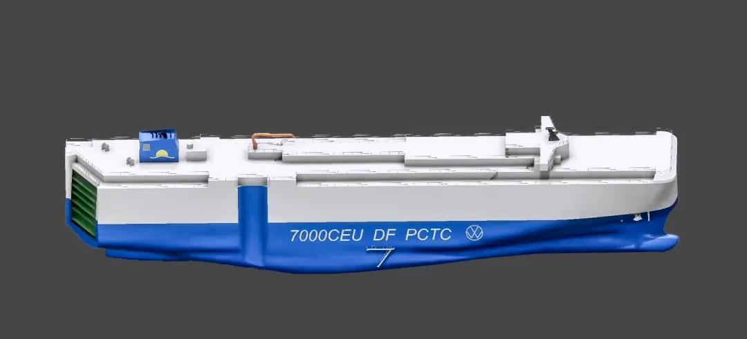 該型船可裝載7000輛汽車,采用先進的天然氣(LNG)/燃油雙燃料推進系統設計,可在3種燃料模式下航行,續航力最高可達15,000海里。配置了高壓岸電系統,采取了減阻防污漆等各類節能措施,EEDI(能效營運指標)滿足國際海事組織最新的第二階段(phaseⅡ)要求,是一艘節能環保高效的汽車運輸船。