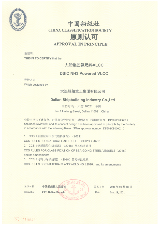 2020年,大船集團研發的液氨動力超大型油船(VLCC)分別取得美國船級社(ABS)和中國船級社(CCS)頒發的AIP證書。